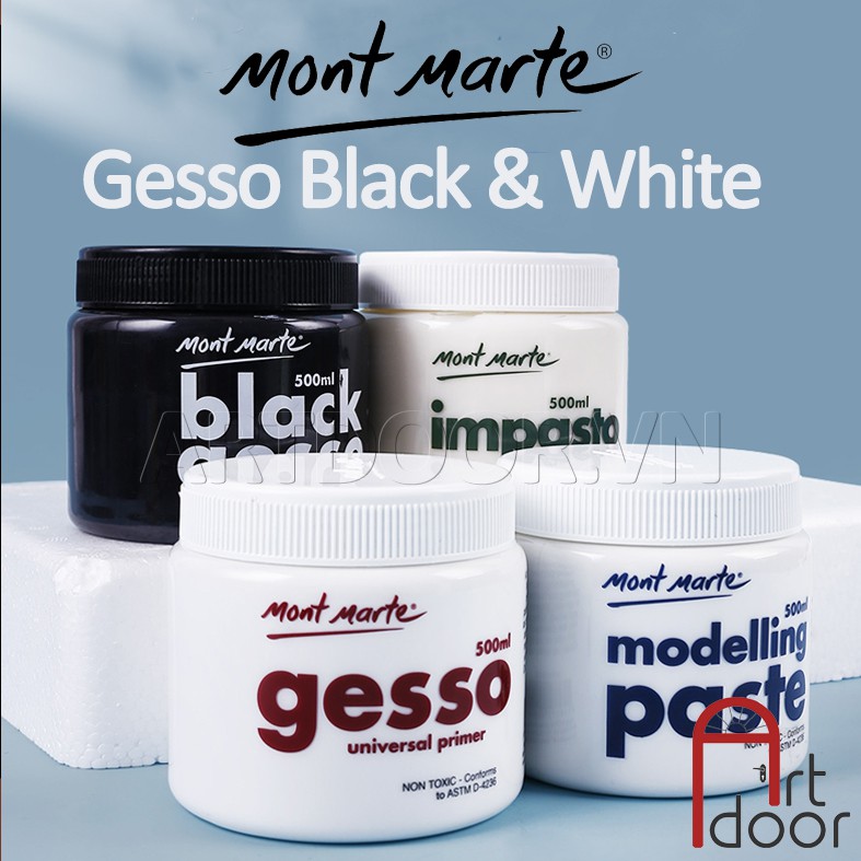 * MONT MARTE Gesso đen : là một loại sơn lót màu đen, nên phủ từ 3 - 4 lớp, sau khi khô sẽ tạo lớp nên màu đen. Loại màu đen có thể chà nhám giữa các lớp để tạo bề mặt siêu mịn, rất thích hợp cho các tác phẩm cần độ chi tiết. Đặc biệt, màu đen giúp thêm độ tương phản ấn tượng và tạo các hiệu ứng thú vị mà loại gesso trắng thông thường không có được, có thể được pha loãng với nước. Được sử dụng trên vải canvas, giấy bìa cứng và gỗ. Sau khi lớp lót khô có thể vẽ được acrylic, sơn dầu, phấn màu. Thời gian khô trong vòng 2 giờ, sẽ lâu hơn nếu dùng nhiều. Làm sạch dụng cụ bằng nước.