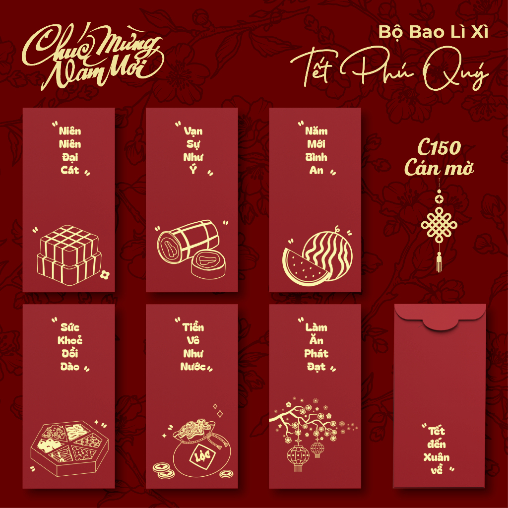 Set bao lì xì Tết 2026 Thiết kế Hoa lá mùa xuân, Hoa Sen, Tết Gia Đình Đoàn Viên - Giấy C150 dày cán màng cao cấp