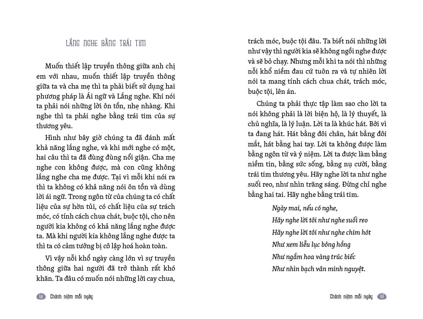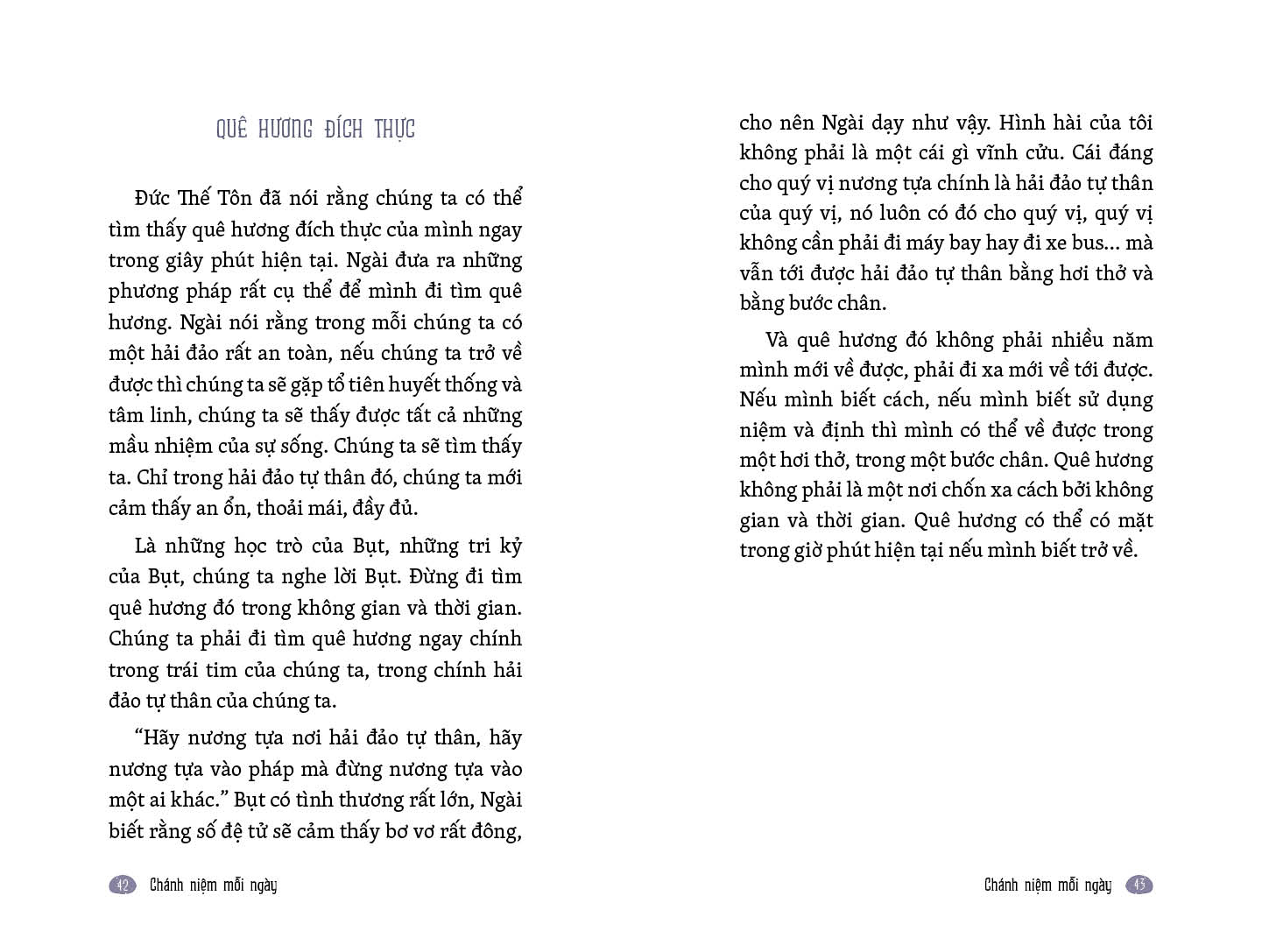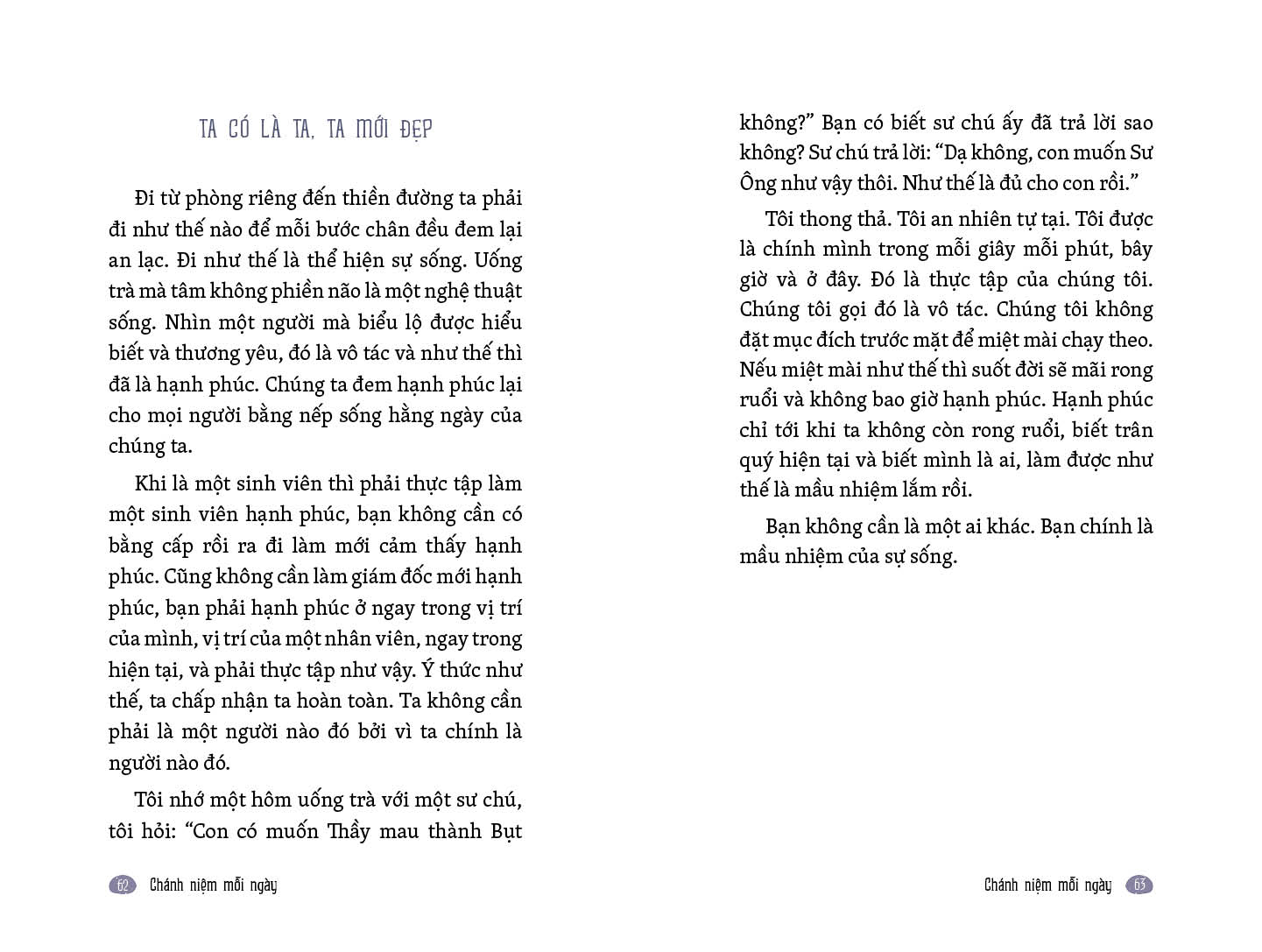 Cuốn sách ghi chép những lời dạy của Thầy Nhất Hạnh được trích dẫn nguyên văn từ những cuốn sách đã xuất bản hay trên trang nhà Làng Mai. Tác giả đã sắp xếp khéo léo để mỗi bài vừa đúng hai trang để ai cũng có thể đọc trọn vẹn hết ý của Thầy mà không phải lật sang trang mới.