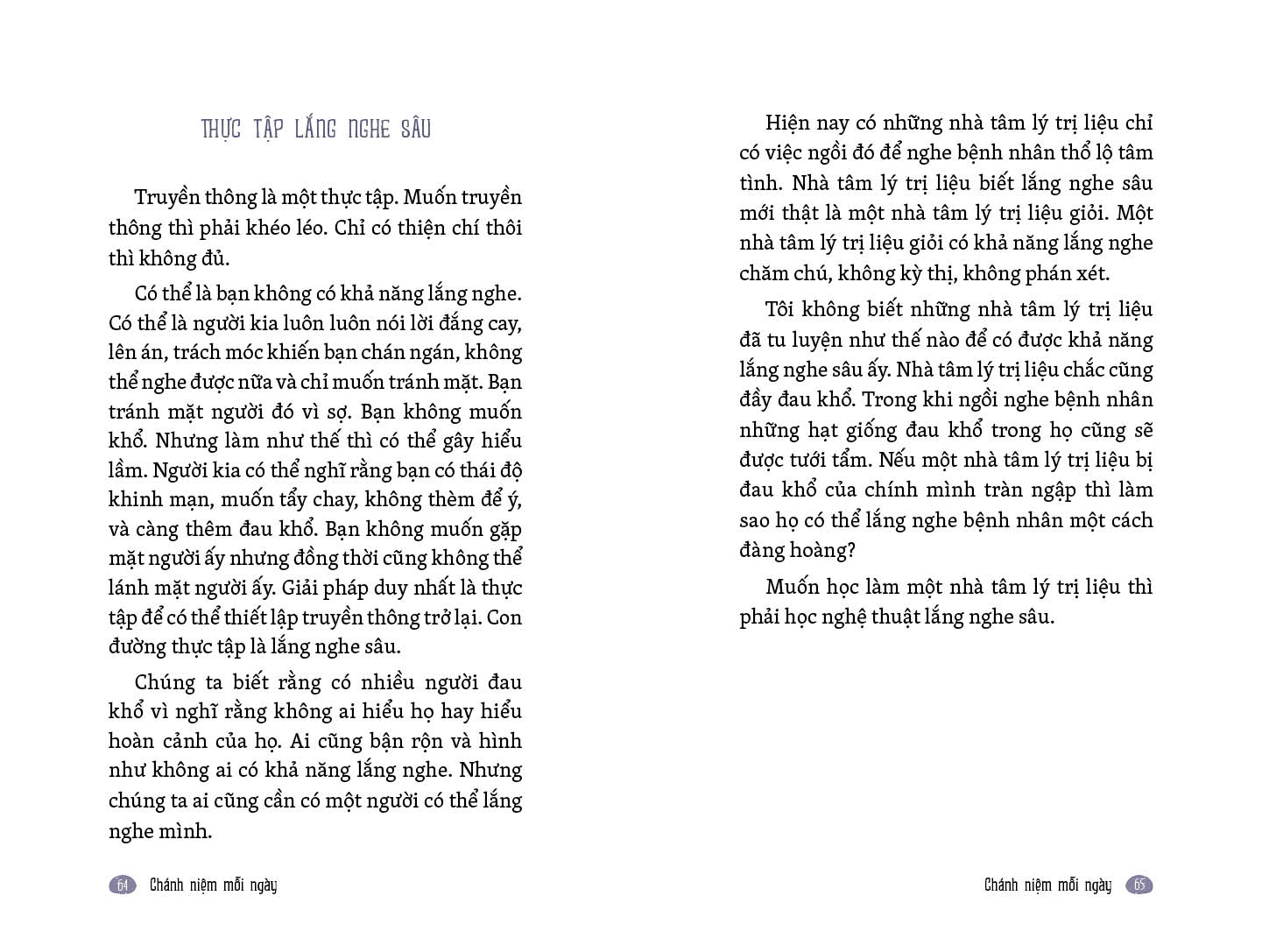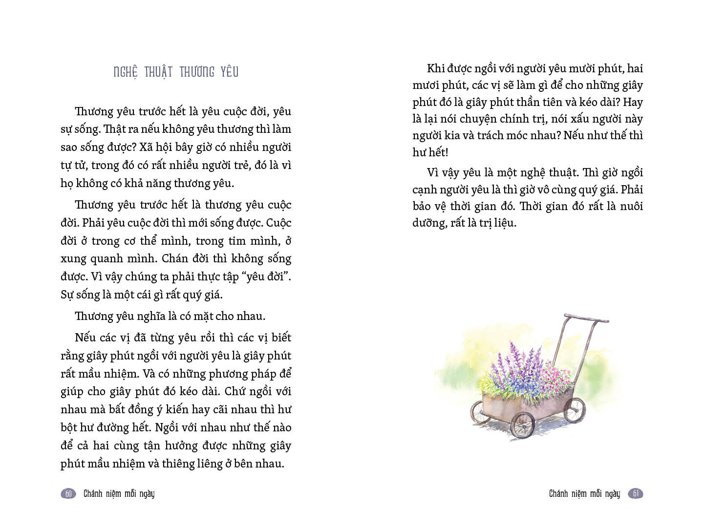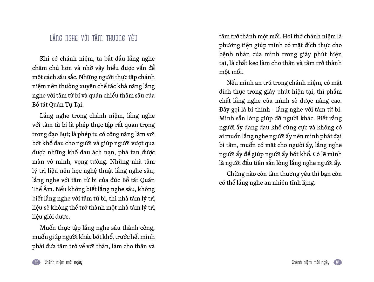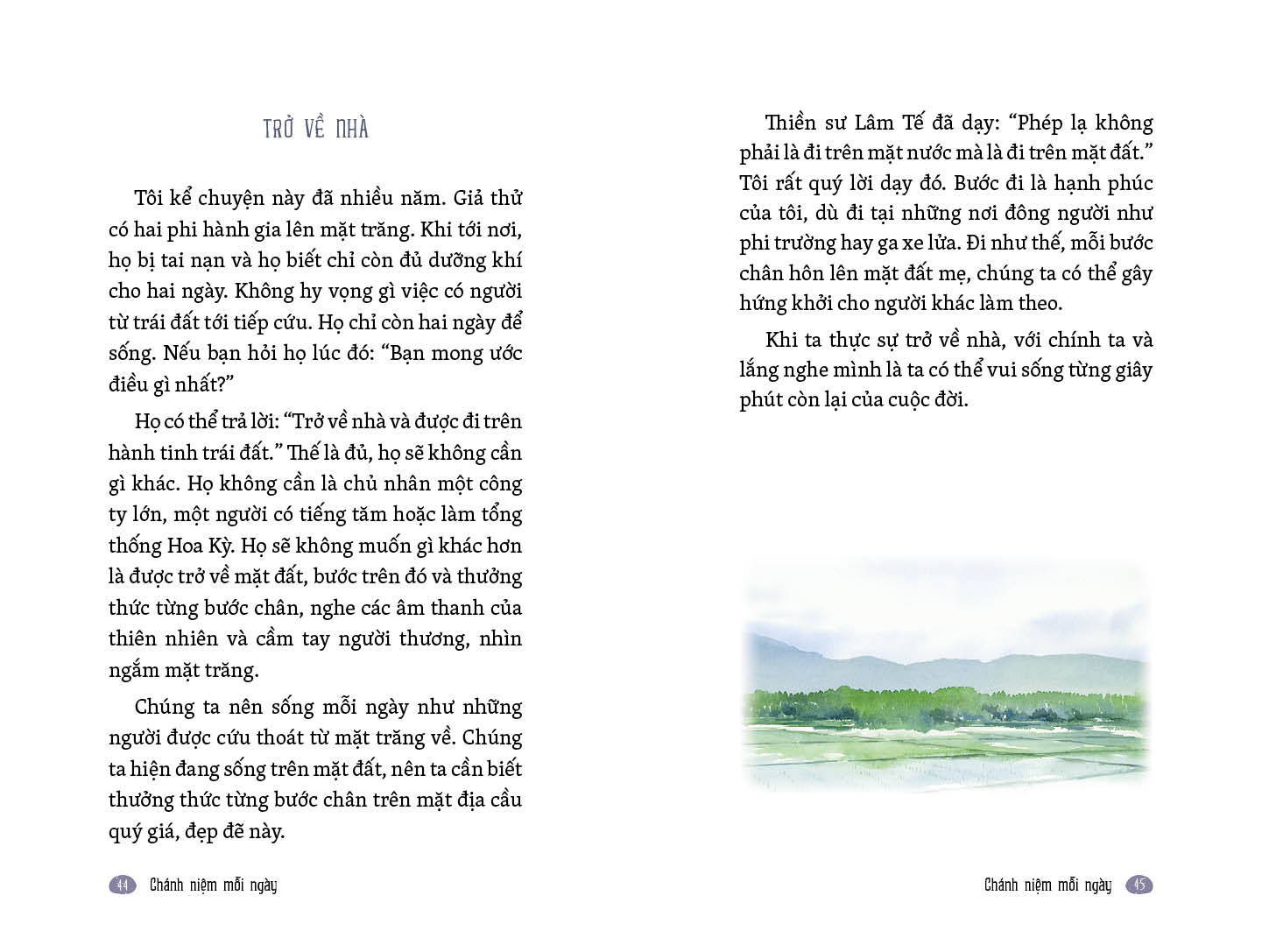 Cuốn sách ghi chép những lời dạy của Thầy Nhất Hạnh được trích dẫn nguyên văn từ những cuốn sách đã xuất bản hay trên trang nhà Làng Mai. Tác giả đã sắp xếp khéo léo để mỗi bài vừa đúng hai trang để ai cũng có thể đọc trọn vẹn hết ý của Thầy mà không phải lật sang trang mới.