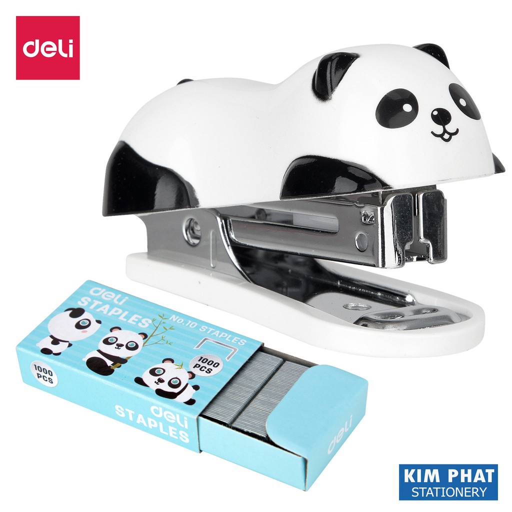 Giới thiệu Dập ghim nhỏ, bấm kim số 10 hình gấu trúc dễ thương kèm 1 hộp Chân ghim Deli E0453