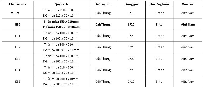 Kệ mica 2 mặt Enter để bàn là sản phẩm làm từ Mica Đài Loan, có công dụng trưng bày thực đơn, hiển thị giá cả sản phẩm tại các nhà hàng, khách sạn... sản phẩm này còn được dùng như một standee để bàn quảng cáo sản phẩm một cách ấn tượng nhất.