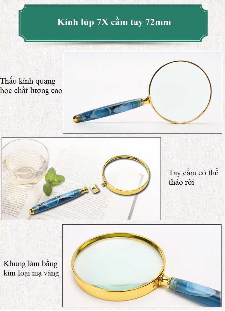 Kính lúp 7X cầm tay 72mm thiết kế khung kim loại mạ vàng tinh tế, sang trọng và tay cầm hoa văn rất tinh xảo như một viên đá thô tự nhiên. Sờ tay vào có cảm giác ẩm mịn tinh tế, sự đơn giản nhưng không làm mất đi vẻ đẹp, nó thực sự là một sản phẩm đáng để bạn lựa chọn.