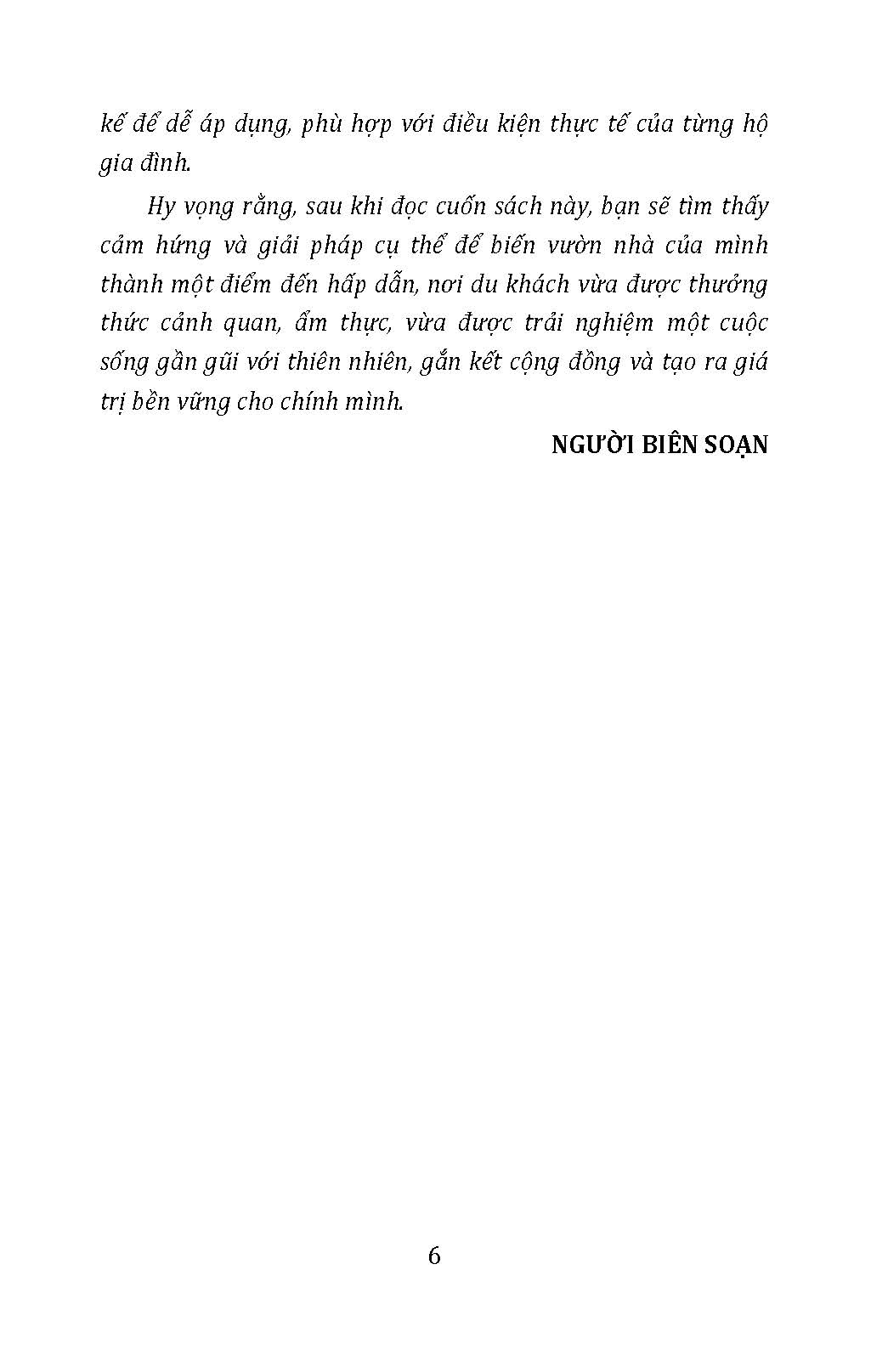 Hướng dẫn người nông dân và các hộ gia đình cách tổ chức, vận hành và phát triển mô hình du lịch tại vườn nhà theo nguyên tắc xanh – sạch – bền vững; tập trung vào các khâu cụ thể như chuẩn bị cơ sở vật chất, quy hoạch vườn, thiết kế các hoạt động trải nghiệm, và quản lý khách tham quan, nhằm giúp các hộ gia đình tăng thu nhập đồng thời bảo vệ môi trường và nâng cao giá trị văn hóa địa phương.