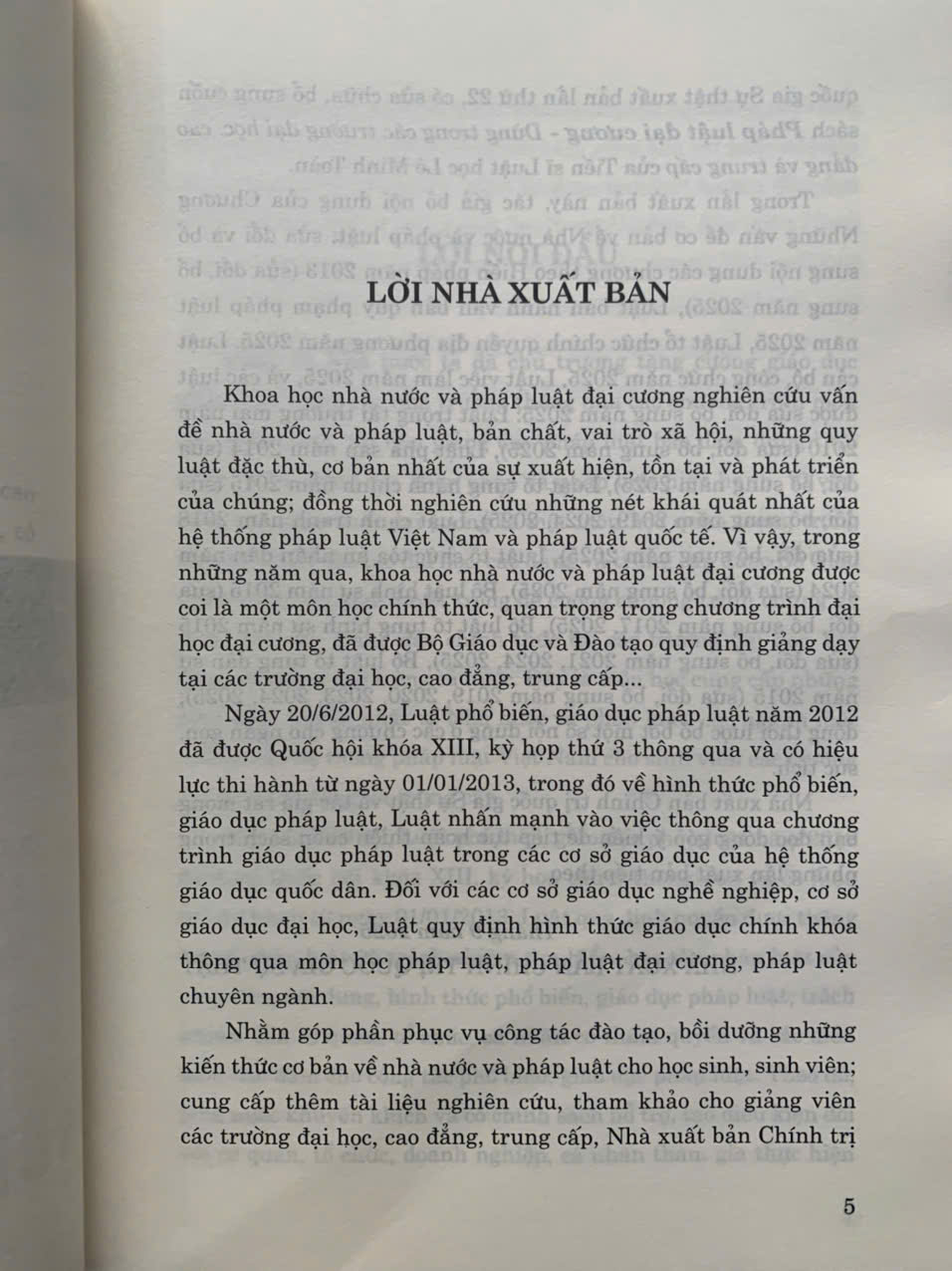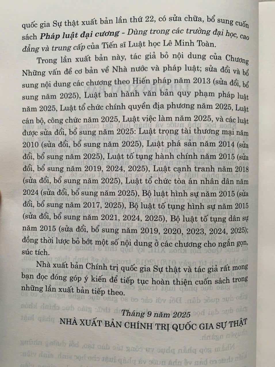 Nhằm góp phần phục vụ công tác đào tạo, bồi dưỡng những kiến thức cơ bản về Nhà nước và Pháp luật cho học sinh, sinh viên; cung cấp thêm tài liệu nghiên cứu, tham khảo cho giảng viên các trường đại học, cao đẳng, trung cấp, Nhà xuất bản Chính trị quốc gia Sự thật xuất bản lần thứ 22, có sửa chữa, bổ sung cuốn sách “Pháp luật đại cương – Dùng trong các trường đại học, cao đẳng và trung cấp” của Tiến sĩ Luật học Lê Minh Toàn.