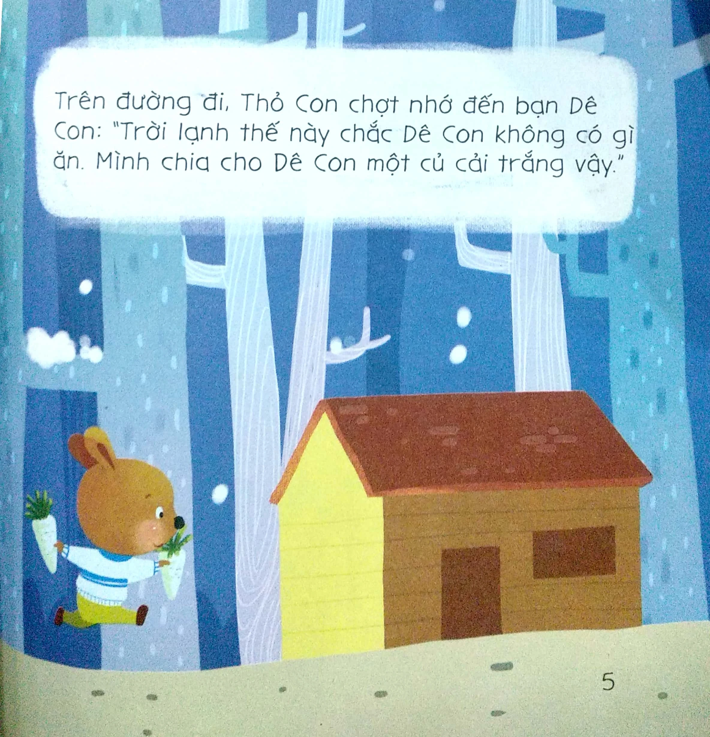 - Mùa đông băng giá, nguồn thức ăn cạn kiệt, Thỏ con, Dê con và Hươu con đều phải tự mình đi tìm kiếm thức ăn. Nhưng khi tìm được cả ba đều không ăn ngay hoặc mang về nhà cất cho riêng mình mà đều nghĩ tới những người bạn và sẵn sàng chia sẻ phần thức ăn của mình. Câu chuyện dễ thương của Thỏ, Dê và Hươu đề cao tình bạn, sự chia sẻ, giúp đỡ lẫn nhau trong lúc khó khăn.