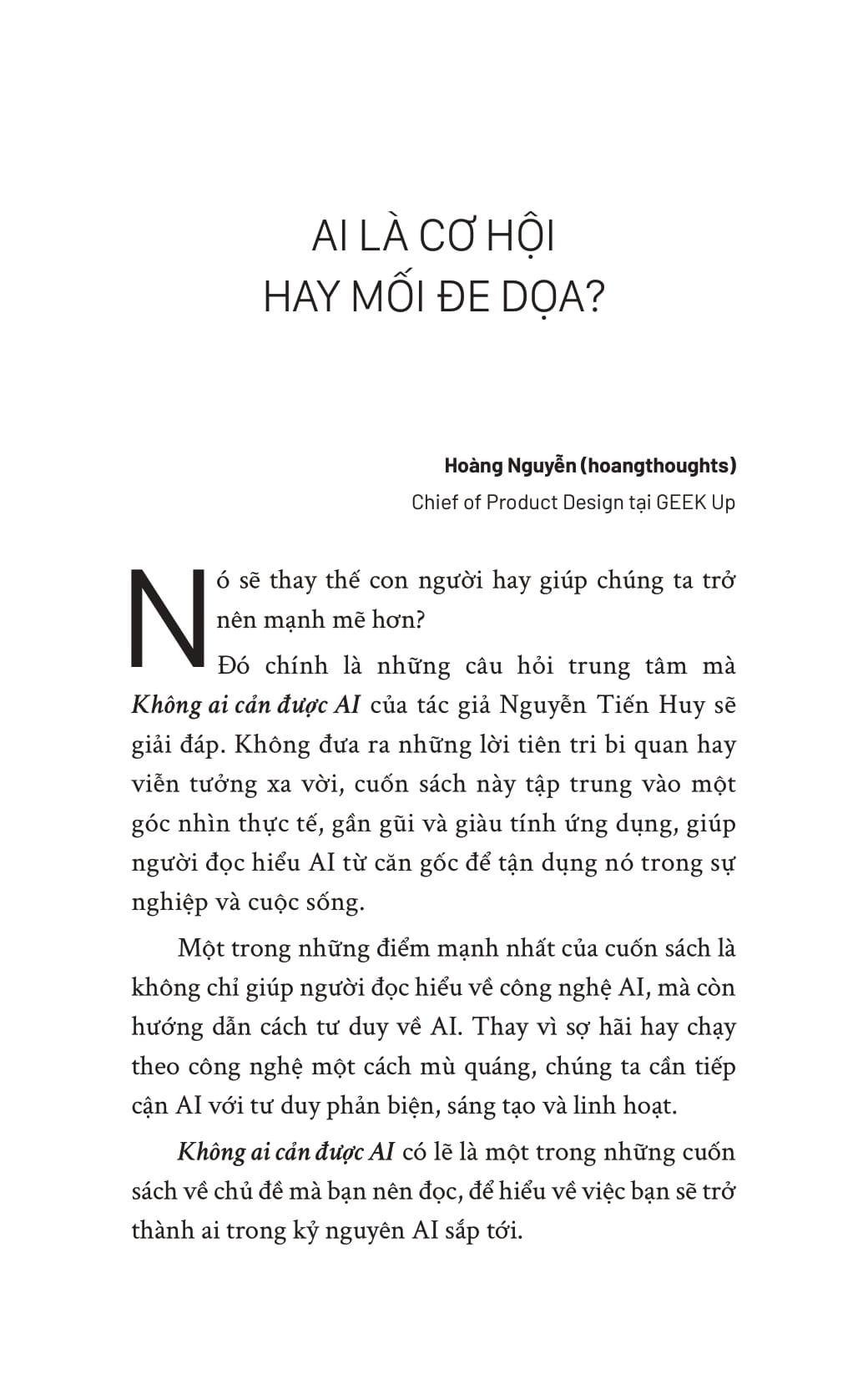 Một trong những điểm mạnh nhất của cuốn sách là không chỉ giúp người đọc hiểu về công nghệ AI, mà còn hướng dẫn cách tư duy về AI. Thay vì sợ hãi hay chạy theo công nghệ một cách mù quáng, chúng ta cần tiếp cận AI với tư duy phản biện, sáng tạo và linh hoạt.