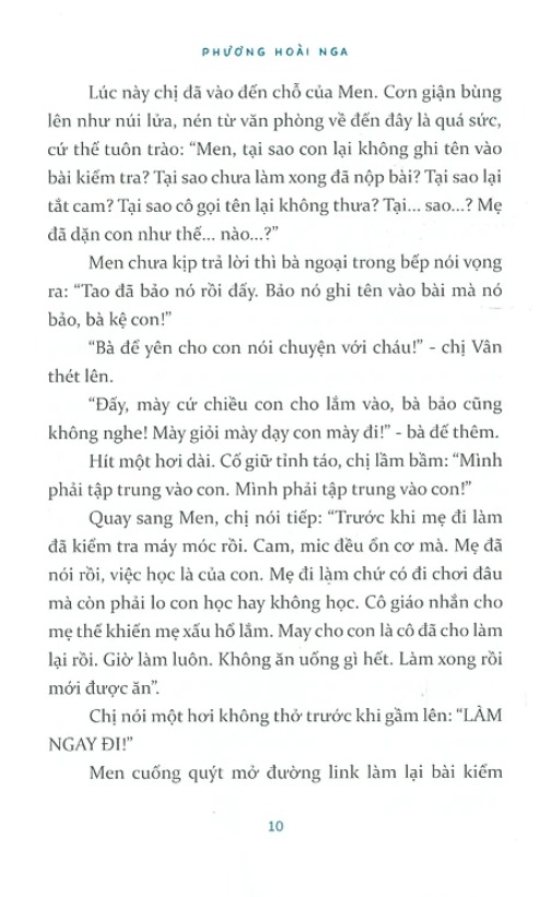 - Một cuốn sách đồng hành với cái khó của cha mẹ, lý giải và giúp họ có một quãng nghỉ để nhìn thấu vào những chuyển động nội tâm của chính mình, dần đối diện, vượt qua những rào cản của xã hội và của cả bản thân, mở ra cánh cửa đến với hành trình thực sự trở thành cha mẹ, can đảm dệt nên những ký ức đầy ý nghĩa với bản thân mình và con.