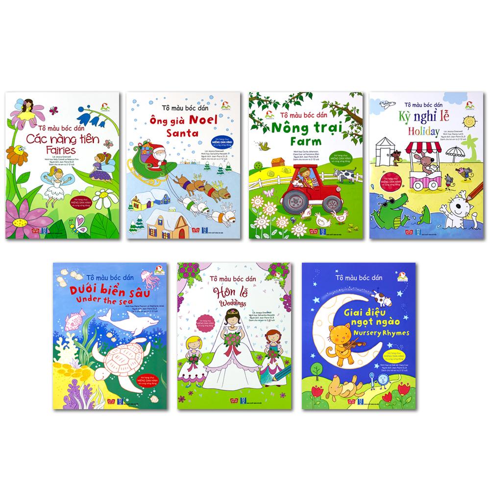 Tô màu bóc dán - Bộ 7 quyển (Phần 2: Các nàng tiên, Dưới biển sâu, Kỳ nghỉ lễ, Nông trại, Ông già Noel, Giai điệu ngọt ngào, Hôn lễ)