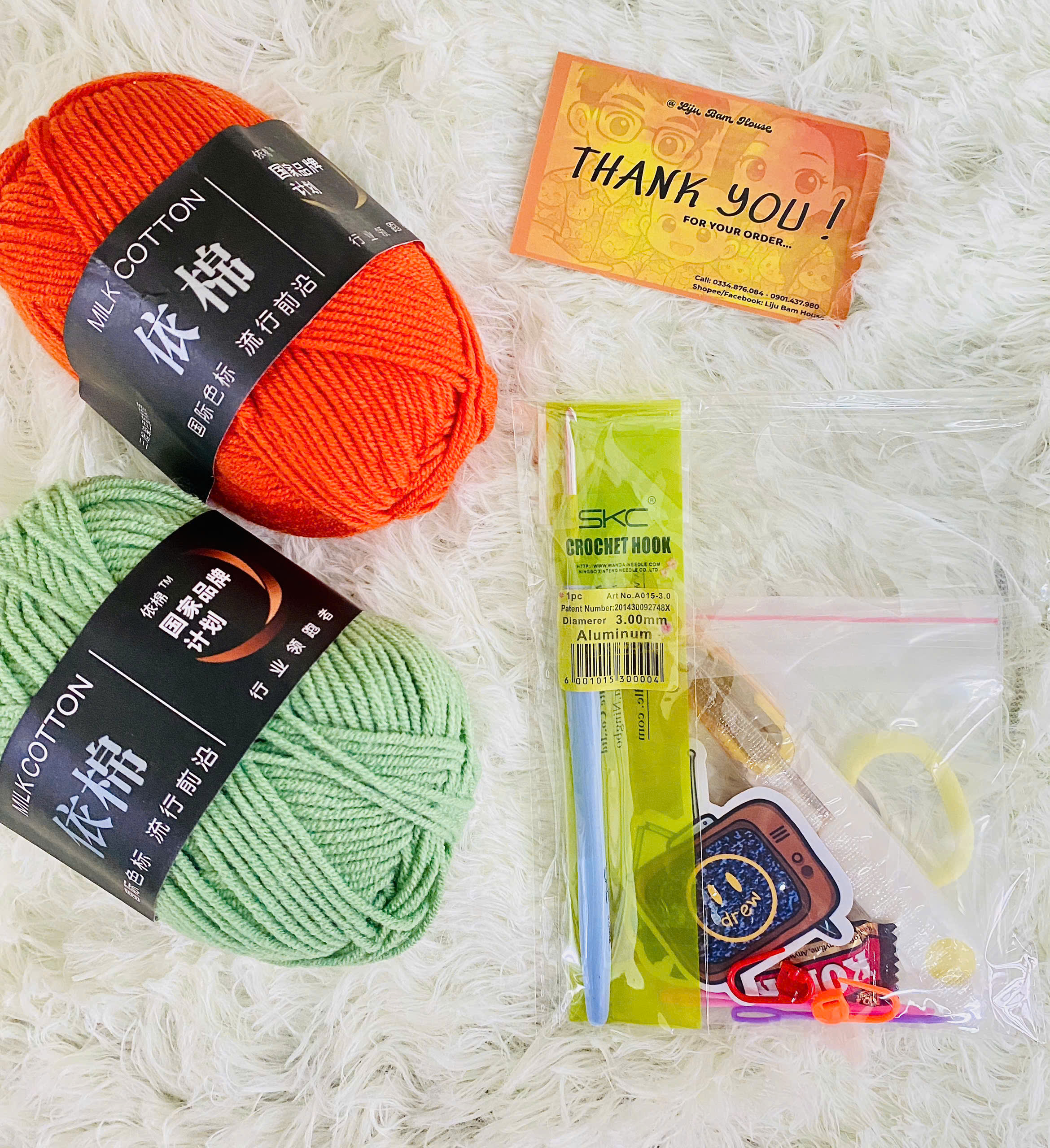 Set này lý tưởng cho người mới bắt đầu, muốn trải nghiệm handmade hoặc tìm quà tặng độc đáo. Bộ sản phẩm bao gồm 2 cuộn len Milk Cotton Mác Đen, 2 bịch bông Gòn Bi nhỏ= 25G, và đầy đủ phụ kiện học móc.